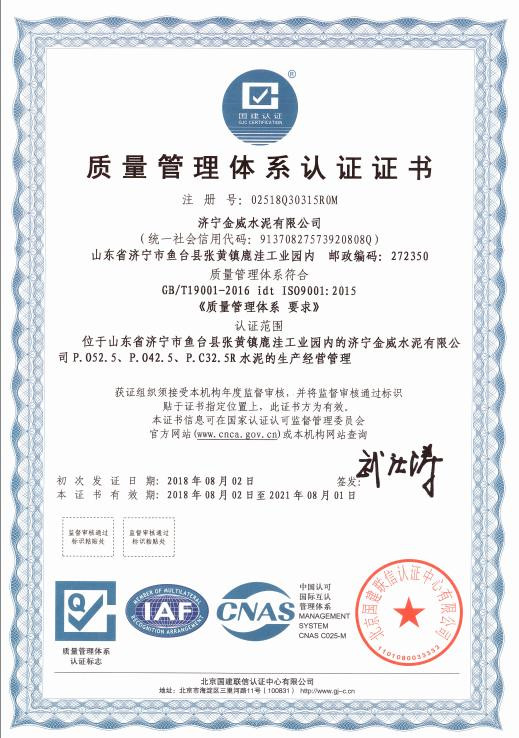 近日,金威水泥通过了北京国建联信认证中心对公司质量管理体系、环境管理体系和职业健康安全管理体系认证。