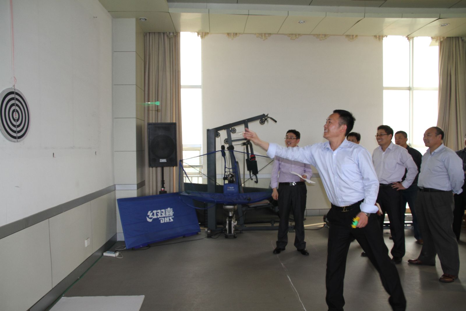 此次趣味运动会分为左手托乒乓球跑、双人绑腿跑、你抛我接、飞镖掷准、跳绳、单腿跳、够级、台球等8个比赛项目。